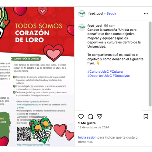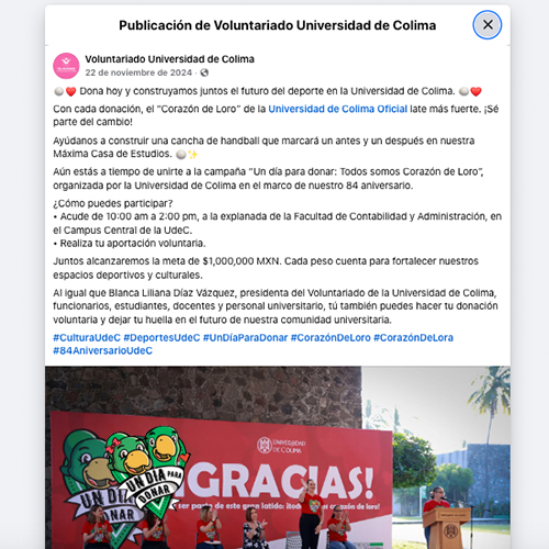 Post: “Dona hoy y construyamos juntos el futuro del deporte en la UdeC… Un día para donar: Todos somos Corazón de Loro”.